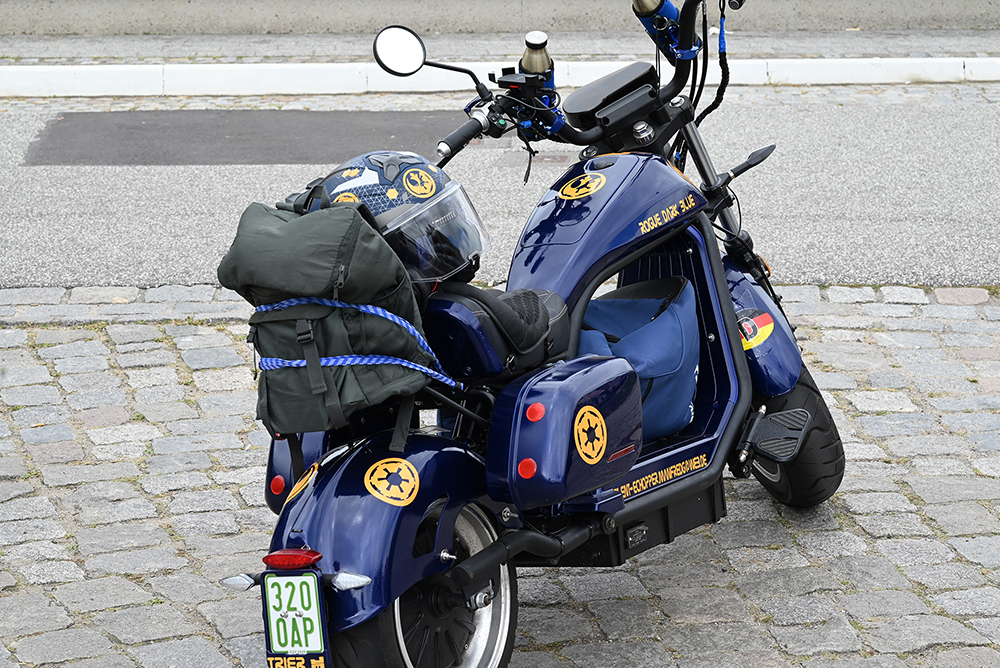 Ihr kennt unser Handicap - die Reichweite -. Deswegen machen wir auf dem E-Chopper-Corso möglichst viele Stopps und haben Spaß. Sehen und gesehen werden gehört schließlich genauso zu unseren Geräten, wie der dicke Hinterreifen.