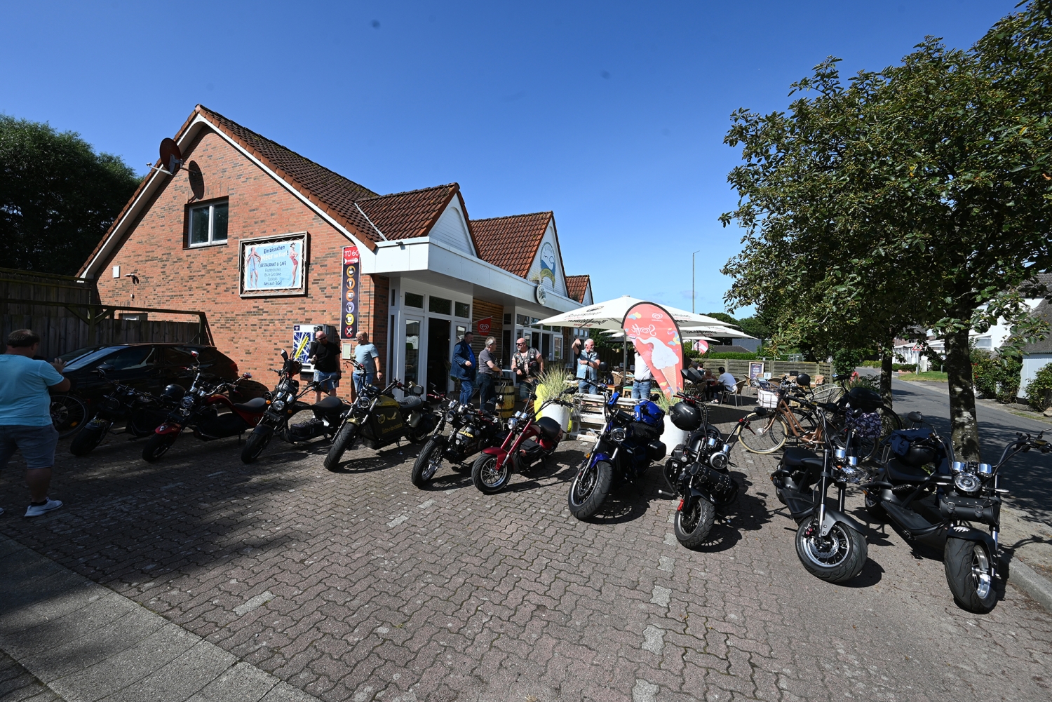 Ihr kennt unser Handicap - die Reichweite -. Deswegen machen wir auf dem E-Chopper-Corso möglichst viele Stopps und haben Spaß. Sehen und gesehen werden gehört schließlich genauso zu unseren Geräten, wie der dicke Hinterreifen.